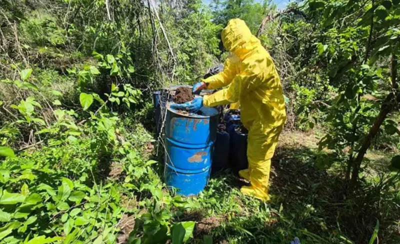 Durante recorridos en la zona de Montelargo, las autoridades aseguraron 4,800 kilogramos de metanfetamina, 47,550 litros de sustancias químicas y equipo utilizado para la fabricación de drogas, incluyendo reactores, condensadores y mezcladoras industriales. El material fue puesto a disposición del Ministerio Público para las investigaciones correspondientes.